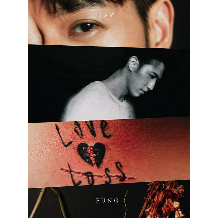 去年Jay的唱片配合吸血鬼三步曲,以红黑色为主调,充满电影感。今次全新专辑《LOVE & LOSS》走成熟风格,以沉实色调。唱片封面Jay颈后有纹身,手臂和脸上有伤疤特技化妆,像真度极高,他笑说:「大家唔使惊,唔使心痛,系特技化妆,好似呀!」